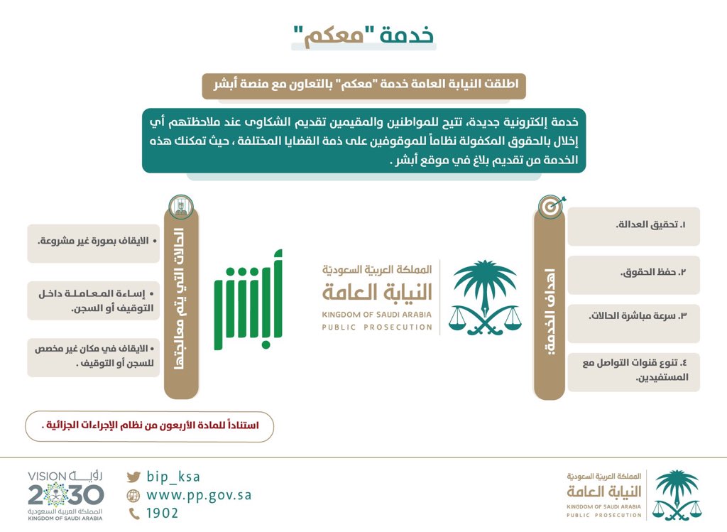 أطلقت النيابة العامة خدمة معكم بالتعاون مع منصة أبشر، وتعتبر قناة رقمية رسمية تمكن المواطنين والمقيمين من الإبلاغ عن حالات الإيقاف أو السجن التي يشتبه في أنها غير متوافقة مع الأنظمة أو الممارسات الصحية للمحتجزين، أو عن حالات إساءة المعاملة أو الاحتجاز في أماكن غير مخصصة. باختصار، خدمة معكم هي قناة تواصل مباشر بين المجتمع والنيابة العامة للإبلاغ والمطالبة بالتحقق واتخاذ الإجراءات اللازمة.