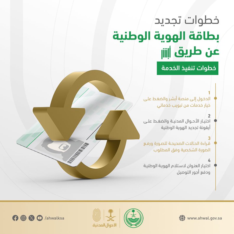 تمثل خدمة تجديد بطاقة الهوية الوطنية عن طريق أبشر أحد النماذج الناجحة لتبسيط الخدمات الحكومية ، توفر هذه الخدمة الوقت، وتختصر كثير من الإجراءات، وتمنح المواطن تجربة رقمية متكاملة وآمنة.